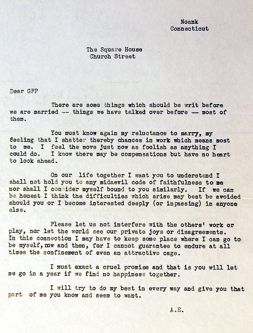 De hecho, eso quedó consignado en una carta que le envió a su prometido, George Palmer Putnam, en la que especificó claramente cómo sería su matrimonio - abierto: