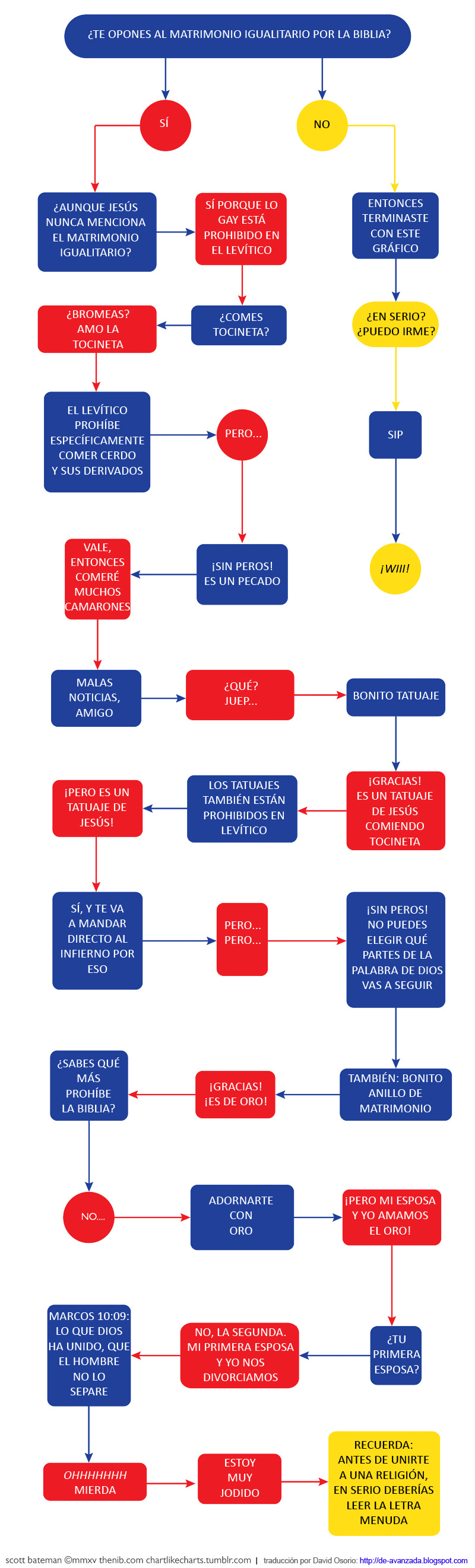The Nib facilita este sencillo diagrama de flujo para averiguar por tus creencias sobre el matrimonio igualitario y las inconsistencias de justificar una postura con la Biblia; lo he traducido para ustedes: