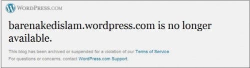 Qué vergüenza que un sitio de alojamiento de blogs, como Wordpress se haya prestado tan vilmente para la censura. Finalmente decidieron reversar la medida (e insisten en que no tuvo nada que ver con las absurdas demandas del CAIR) y Bare Naked Islam vuelve a estar funcionando (quién sabe hasta cuándo).