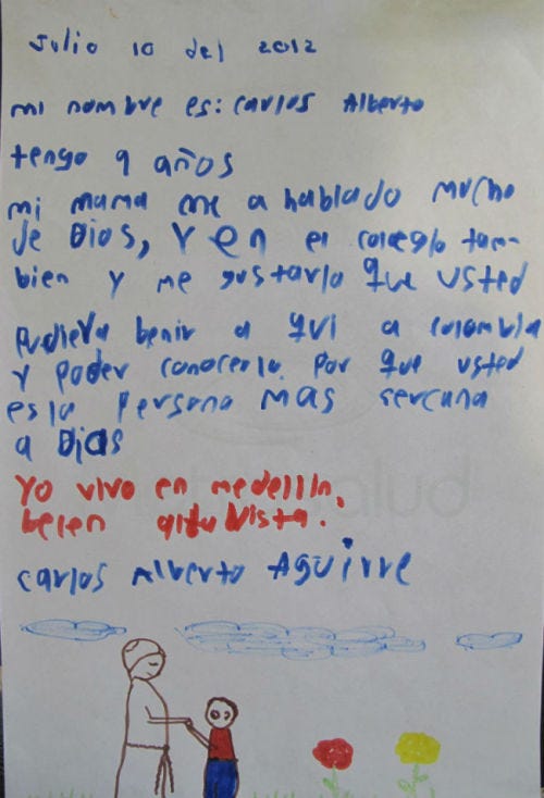 Con esta campaña se busca que los menores de la ciudad escriban un mensaje o hagan un dibujo alegórico al Sumo Pontífice invitándolo para que incluya a Medellín en su próxima agenda a Latinoamérica, la cual está programada para comienzos de 2013.