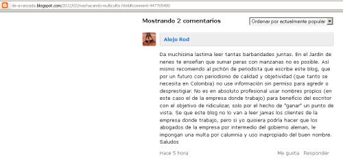 Así que señor Rodríguez o lo que sea que represente el "Rod" en su usuario, ¡denúncieme! Por favor, venga y hágalo acá en Colombia, que en este momento nada me daría más satisfacción que ver a un fiscal cagársele de la risa en la cara por lo que pretende.