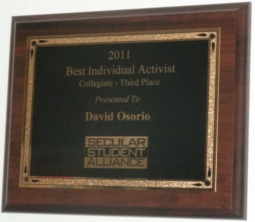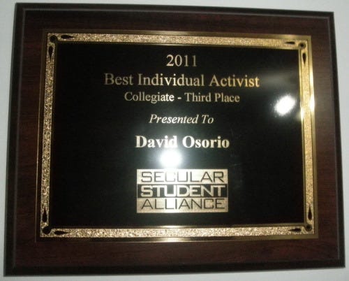 Hace como dos meses me enteré que había el tercer premio del año de la Secular Student Alliance (Alianza Laica de Estudiantes) por activismo individual y a los diez días, en la ceremonia de entrega del premio dí un discurso aceptándolo.