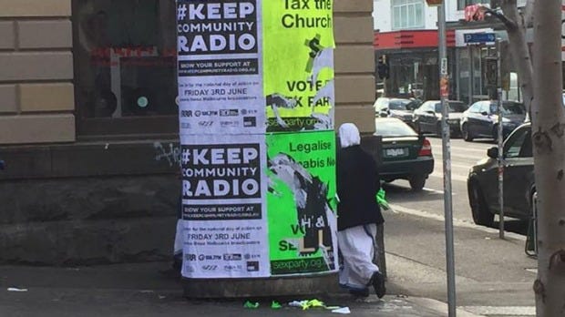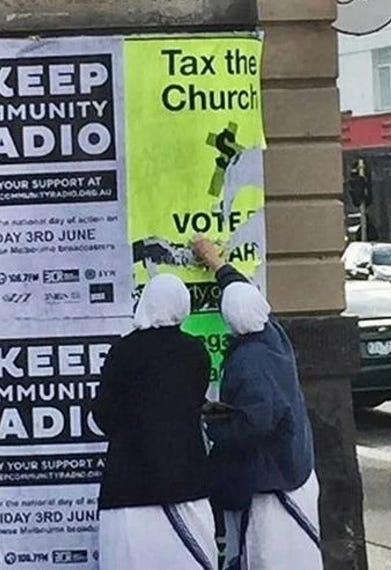 En estos días, dos monjas pertenecientes al movimiento fundado por Teresa de Calcuta, las Misioneras de la Caridad, desfiguraron dos carteles del Partido del Sexo en Melbourne (Australia), uno que pedía que se le cobren impuestos a las iglesias y otro que pedía la legalización de la marihuana: