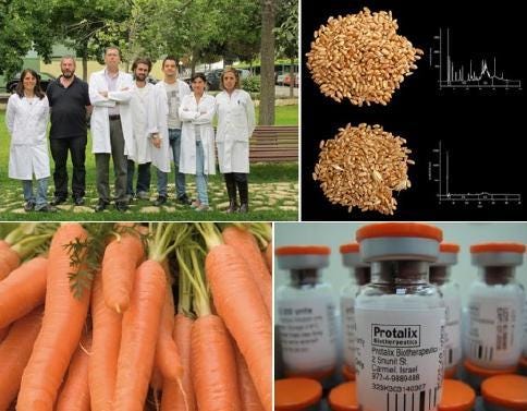 Lo de la toxina Bt en la sangre de las mujeres en Canadá fue ampliamente comentado en círculos académicos: se usó un test no validado, que no detecta la proteína completa y resulta a lo menos curioso que casi el 100% de las mujeres del estudio dieran positivo para la proteína bt. Lo más curioso es que los valores plasmáticos descritos por los autores están en muchos casos fuera del límite de detección del método usado y si se extrapola la cantidad de toxina hallada en la sangre con el volumen plasmático de las mujeres, supone un consumo de varios kilógramos de hojuelas de maíz transgénico, uno de los pocos productos para consumo humano que podrían contener a la proteína Bt. Y por cierto, más allá de la supuesta detección de la proteína Bt, queda la pregunta: ¿Cuál es el significado biológico de esto? Las proteínas Bt se han usado en los últimos 60 años como biopesticidas, por lo que llevamos 60 años comiéndonos esas proteínas. De hecho, es uno de los productos autorizados para ser usados en la agricultura orgánica.Algunas aplicaciones médicas en alimentos transgénicos: (Arriba) Trigo apto para enfermos celiacos – CSIC, España 2011. (Abajo) Taliglucerasa alfa producida en zanahorias para enfermedad de gaucher- Protalix, 2011