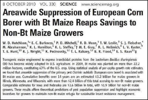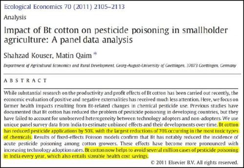 Finalmente, lo de los suicidios en la india, es sencillamente una mentira. La IFPRI, una agencia internacional sin fines de lucro que estudia políticas alimentarias en países pobres, publicó un estudio de 64 páginas que prueba que esa historia no es más que una leyenda urbana.Beneficios económicos por 7.000 millones de dólares en 14 años para los agricultores solo en USA por menor uso de pesticidas, incluso entre quienes cultivan maíz convencional.