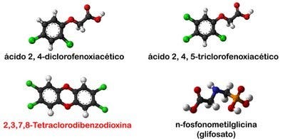 El agente naranja es parte de un plan que fue usado durante la guerra de Vietnam para acabar con la selva: la idea era rociar diferentes herbicidas (cada uno venía en tambores pintados de color, de ahí el nombre del agente naranja) para lograr disminuir la espesura de la selva y permitir a la milicia estadounidense enfrentar mejor al Viet Cong. El agente naranja está formado por la mezcla de dos herbicidas: 2,4D y 2,4,5T. Ambos son muy poco tóxicos en humanos y no causan daño alguno. Sin embargo, durante la síntesis de 2,4,5T se produjeron de manera inadvertida pequeñas cantidades (60 ppm) de una sustancia extremadamente tóxica, llamada 2,3,7,8-tetraclorodibenzodioxina. Ésta se produjo como un contaminante al subir la temperatura en la planta de síntesis del 2,4,5T. Lamentablemente la aplicación del agente naranja –que era un herbicida inocuo para los humanos- produjo la muerte de 500 mil personas y daños en otras 500 mil por la presencia de la sustancia tóxica. Actualmente el 2,4,5T está prohibido en todo el mundo debido al riesgo de síntesis accidental de la sustancia tóxica.Arriba: Se muestran las estructuras del 2, 4-D (ácido 2, 4-diclorofenoxiacético) y del 2, 4, 5-T (ácido 2, 4, 5-triclorofenoxiacético), ambos componentes por partes iguales del Agente Naranja. Abajo: Se muestran las estructuras del 2, 3, 7, 8-TCDD (2, 3, 7, 8-tetraclorodbenzodioxina) y de la n-fosfonometilglicina (Glifosato). Código de color: Negro=Carbono, Blanco=Hidrógeno, Rojo=Oxígeno, Verde=Cloro, Azul=Nitrógeno, Naranjo=Fósforo. (Fuente: El Agente Naranja)