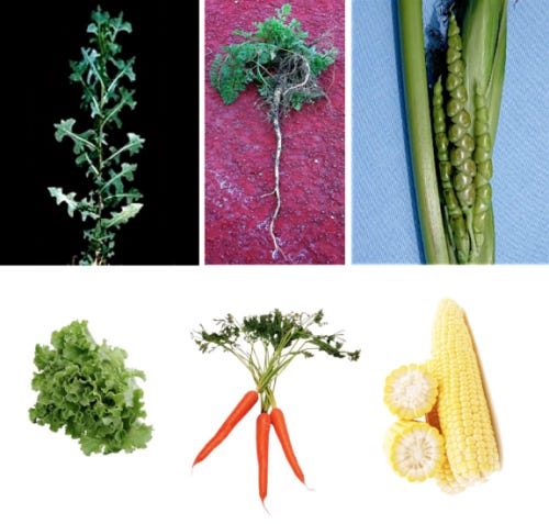 En el caso de los transgénicos, la principal distinción es que han sido creados en el laboratorio usando las herramientas de la ingeniería genética. Esto permite, por ejemplo, introducir genes de una especie en otra. Sin embargo, incluso esto ocurre en la naturaleza: hay árboles que llevan genes de bacterias y caracoles de mar que llevan genes de algas. Esto se llama “transferencia horizontal de genes” y ocurre incluso en los humanos: muchos virus, al infectar, introducen sus genes en nuestro genoma. Lo que los científicos han hecho es escoger unos pocos genes de interés (2 o 3) e introducirlos en los cultivos para hacerlos resistentes a insectos o bien a herbicidas. Las principales ventajas de la ingeniería genética para hacer mejoramiento tienen que ver con la velocidad a la que es posible generar nuevas variedades, y con que se introducen pocos genes y conocidos.Arriba se muestran los ancestros silvestres de la lechuga, zanahoria y maíz. Abajo se muestran los cultivos actuales, obtenidos a partir de los cultivos silvestres, mediante mejoramiento genético. (Fuente: Lo Natural)