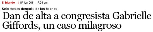 Por ejemplo, tomemos el caso de la congresista gringa Gabrielle Giffords, que a principios de este año fue herida por un impacto de bala en la cabeza y a quien acaban de dar de alta. El periódico titula eso como "un caso milagroso" y procede a explicar que no hubo amigo imaginario sino sólo Ciencia y buena medicina:
