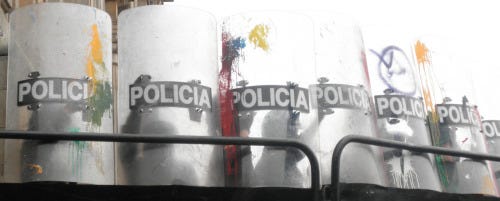 Esos cabrones ayer se acercaban al grupo de policías ubicados con sus escudos plásticos -o de policarbonato- sobre la Séptima con Jiménez para lanzarles botes de pintura y provocarlos, para luego, salir a decir que existe la brutalidad policial -que existe, pero que ciertamente no debe ser provocada con la comisión de delitos, como el ataque a la autoridad-.