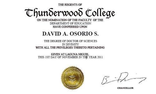 A los interesados en tener una maestría, un doctorado, un posgrado o una especialización en pseudociencias, magufería y venta de aire, siempre pueden asistir a el Thunderwood College. ¡¡Es gratuito! Como siempre ha debido ser la educación!