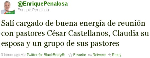 Además de todo lo que ya he denunciado sobre este señor, por el que no votaría ni siquiera para presidente de su edificio, así mi vida dependiera de ello, ahora se suma el hecho de que hace campaña con visitas a líderes cristianos: