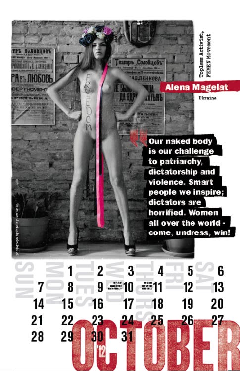 Nuestro cuerpo desnudo es nuestro reto al patriarcado, la dictadura y la violencia. Inspiramos a las personas inteligentes; los dictadores están horrorizados. Mujeres de todo el mundo - vengan, desvístanse, ¡ganen!