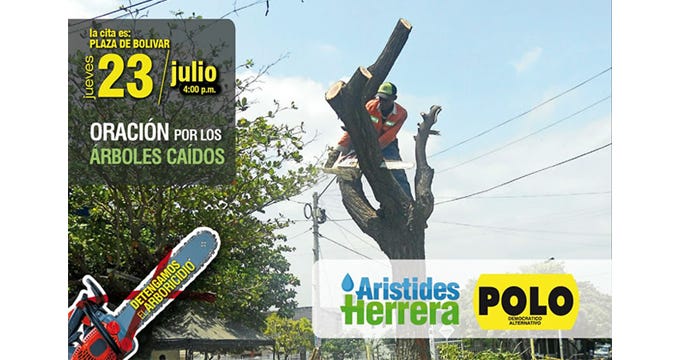 El líder del movimiento Otra Santa Marta es Posible, Aristides Herrera Posada, y los codirectivos del partido Polo Democrático Alternativo, Carlina Sánchez Marmolejo y Vilbrum Tovar Peña, cursaron una invitación a toda la ciudadanía samaria a protestar por el arboricidio perpetrado en las principales avenidas de la ciudad por la administración distrital en su afán de favorecer los intereses de un contrato suscrito con la Concesión Alumbrado Público.