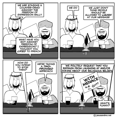 Y, sin embargo eso es lo que los aspirantes a censores siempre están tratando de hacer. En el Colegio St. Mary, en las páginas de otras personas en Facebook, en los festivales de literatura, y en el sitio web de Jesus and Mo, se han entrometido con sus desagradables -y a veces amenazantes- exigencias de silencio.