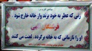 Sip. Eso dice este cartel ubicado en el espacio público de Irán. Con dios y sus ángeles merodeando por ahí, ¿quién necesita ejército o policía para reprimir a las mujeres?