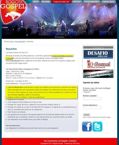 Como somos un Estado laico, los promotores de este asalto a los recursos de todos, han insistido en que no es un evento cristiano sino cultural. Por supuesto, esto sería más fácil de creer si dentro de los requisitos para tocar en Bogotá Gospel no se incluyera el de ser cristiano debidamente afiliado a una de las sectas aliadas: