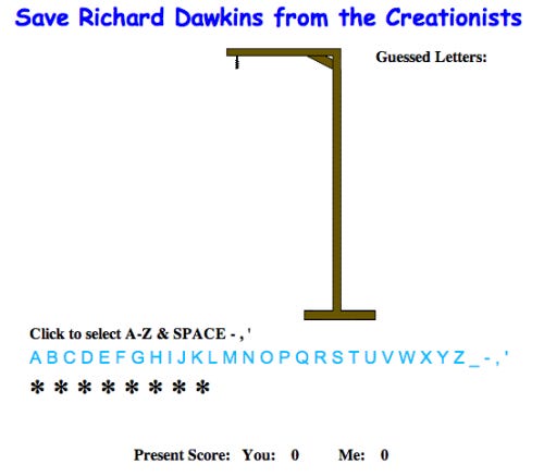 Salva a Richard Dawkins de los creacionistasDavid Osorioabr 08, 2013Compartir¡Miren! Un juego de ahorcado de Richard Dawkins:(vía Friendly Atheist)AnteriorSiguiente
