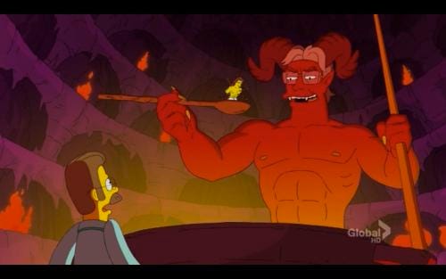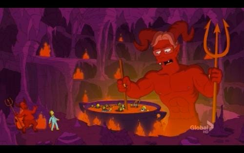 Richard Dawkins apareció en el episodio Black-Eyed, Please de Los Simpson emitido ayer, encarnando un diablo gigante, al final de una pesadilla de Ned Flanders, y su único parlamento fue "Hago estofado de santos católicos".