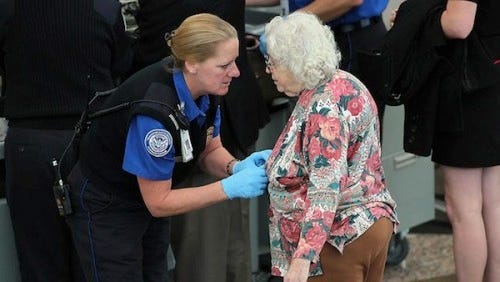 Por supuesto, muchos de mis detractores (como Greenwald) han utilizado esta cita de forma calculada para que los lectores crean que yo quiero que las personas de piel oscura sean señalados - y no sólo en nuestros aeropuertos, sino en todas partes. Lo que mis críticos siempre olvidan decir, sin embargo, es que en el artículo en el que aparece esa frase, incluyo explícitamente hombres blancos, de mediana edad como yo en el perfil (dos veces). Esto todavía deja a muchos millones de viajeros fuera de la perfilación. Lo que quiero decir es que deberíamos estar dando menos atención a las personas que, obviamente, no son yihadistas. Cualesquiera que las dificultades prácticas sean en la implementación de esta política, sigo dispuesto a apostar mi vida a que que la mujer en la foto de abajo no es una terrorista suicida. Lo cual es, por supuesto, decir que la trabajadora del TSA que parece estar buscando su cuerpo en busca de explosivos no sólo está incomodando a la propia mujer, junto con todos en la fila detrás de ella, sino que está poniendo vidas de las personas en peligro al derrochar sus limitados recursos de atención