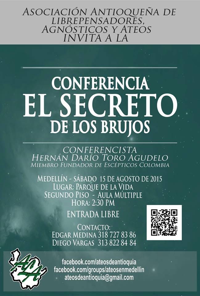 Sin embargo, la Asociación de Ateos y Agnósticos no piensa dejar que termine con ese sinsabor, ya que ofrecerá la conferencia El secreto de los brujos, en el Parque de la Vida en Medellín: