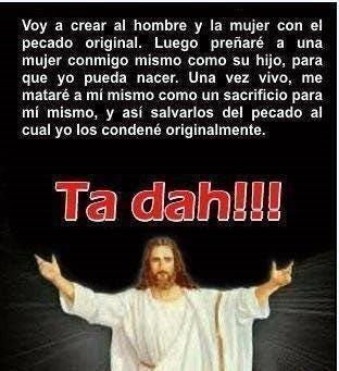 Voy a crear al hombre y la mujer con el pecado original. Luego preñaré a una mujer conmigo mismo como su hijo, para que yo pueda nacer. Una vez vivo, me mataré a mí mismo como un sacrificio para mí mismo, y así salvarlos del pecado al cual yo los condené originalmente.