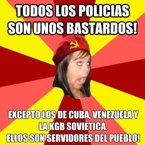 Todos los policías son unos bastardosDavid Osoriomay 02, 2013CompartirExcepto los de Cuba, Venezuela y la KGB soviética. ¡Ellos son servidores del pueblo!(vía Facebook)AnteriorSiguiente