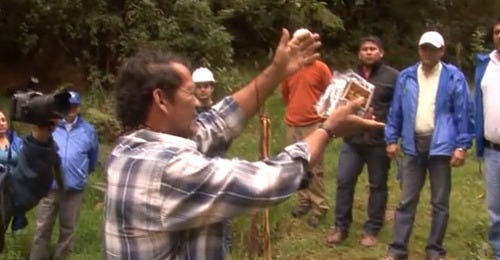 [E]l video muestra que el propio director de Cortolima se involucra en el ritual y es el centro de atracción del chamán, que luego de hacerle quitar la camisa, lo unge con la ‘poción mágica’ de aguardiente, tabaco y rezos.