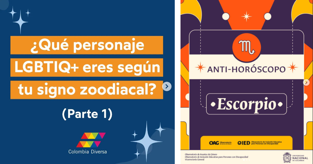 Me había olvidado del tema hasta que en estos días mi amigo Andrés señaló que había una cuenta de Twitter que parecía ser de la Universidad Nacional de Colombia (UNal) en la que se hacían asociaciones similares entre la astrología y los asuntos de género. Pues empecé a tirar del hilo y resulta que más o menos desde mayo de 2024 hay varias cuentas de distintas redes sociales que parecen asociadas a la UNal que están promoviendo esta absurda supuesta relación entre derechos LGBTI y astrología, en lo que han llamado la "campaña del anti-horóscopo". En la dichosa campaña a cada signo le corresponde una supuesta lucha social (anti-racismo, anti-patriarcado, anti-etnicismo, etc), le designan una vela, un ritual, un mantra, y un personaje histórico LGBTI.