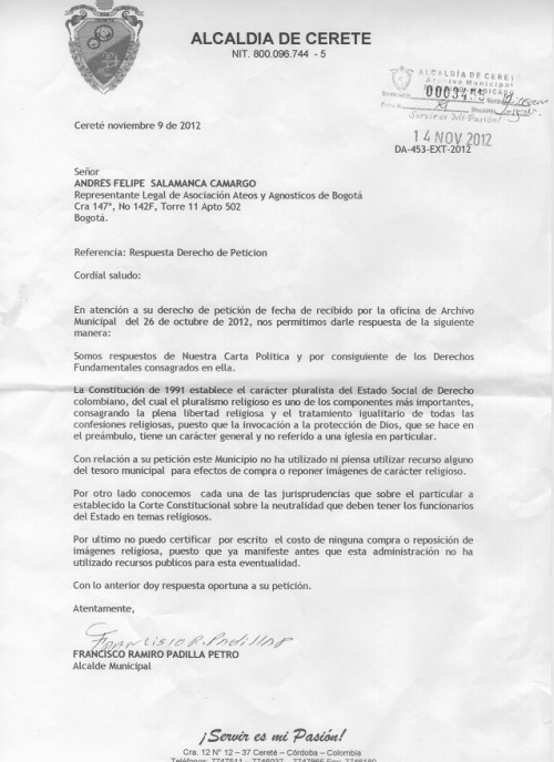 Desde la Asociación de Ateos y Agnósticos de Bogotá le enviamos un derecho de petición a la alcaldía de Cereté, pidiendo que no se destinaran dineros públicos para reponer la imagen. Pues nos acaba de llegar la respuesta de la alcaldía de Cereté, en donde prometen no despilfarrar así el dinero de los contribuyentes:
