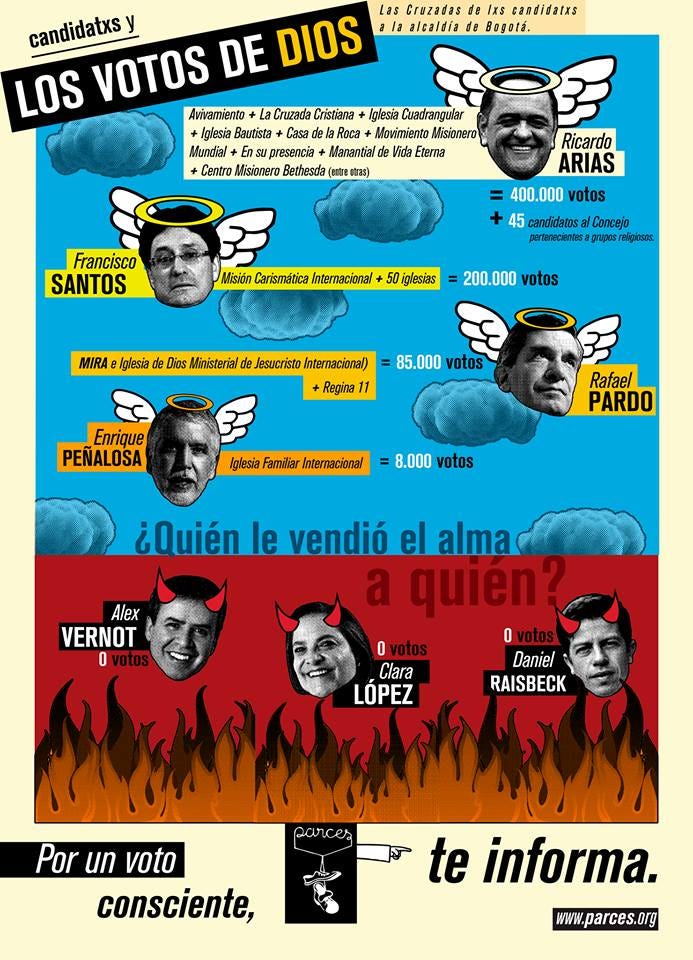 Hoy son elecciones locales en Colombia y la ONG Parces ha publicado esta sencilla infografía donde expone qué campañas tienen lazos con iglesias y cuánto les representa en votos: